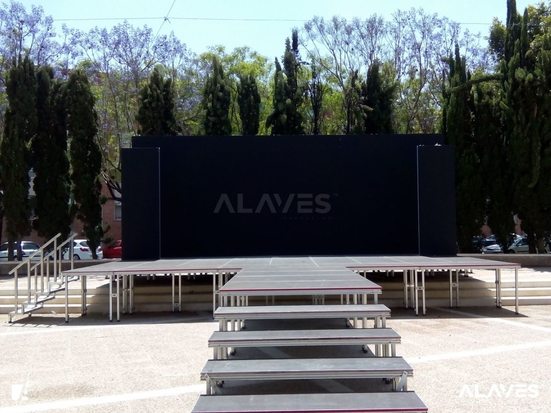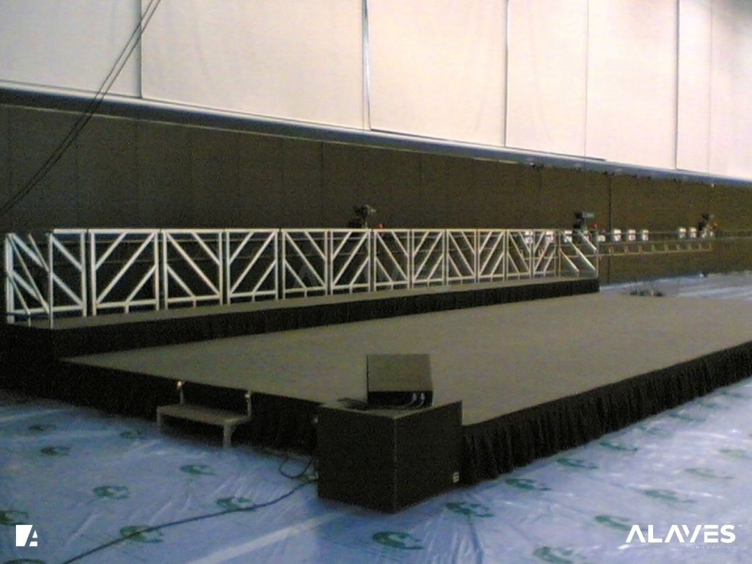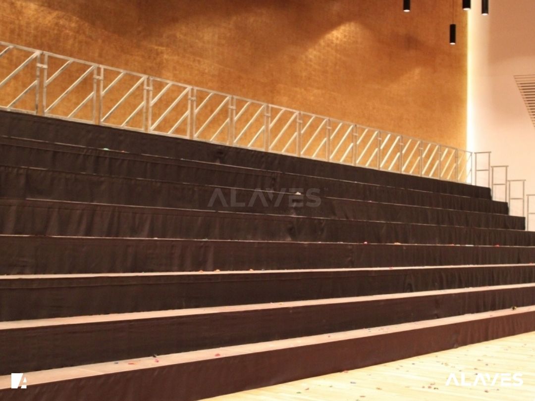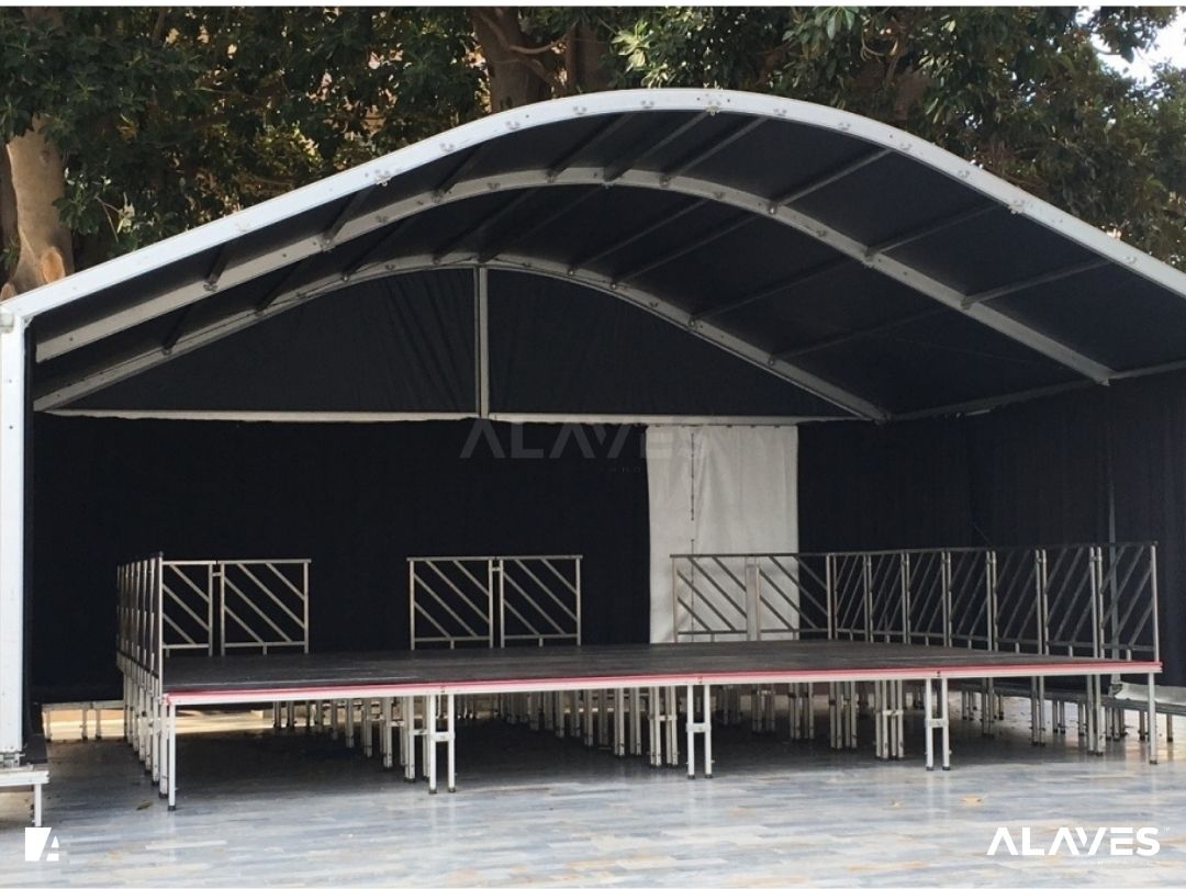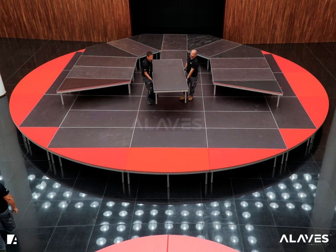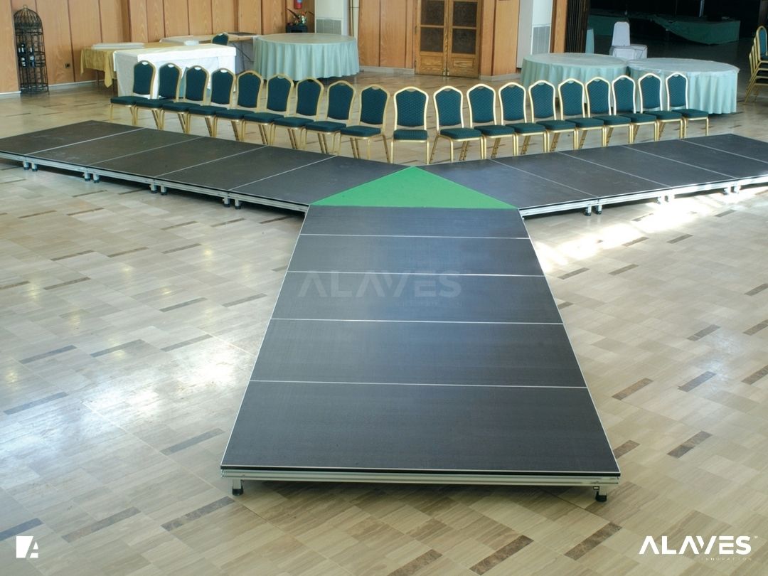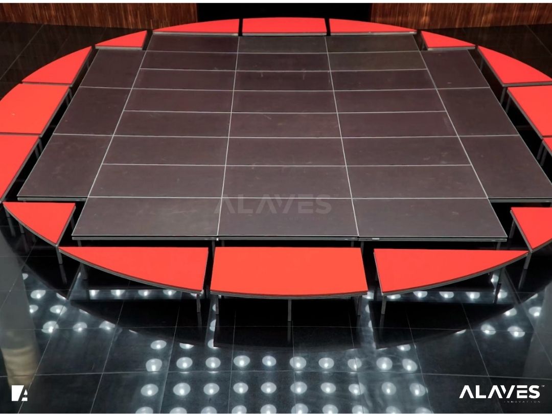 Nuestros escenarios con sistema PROKT™ destacan por su solidez, rapidez de montaje y adaptabilidad a cualquier superficie. Gracias a la combinación de tarimas modulares, patas telescópicas y accesorios patentados, ofrecemos soluciones seguras y versátiles que se ajustan a las necesidades de cada evento.
