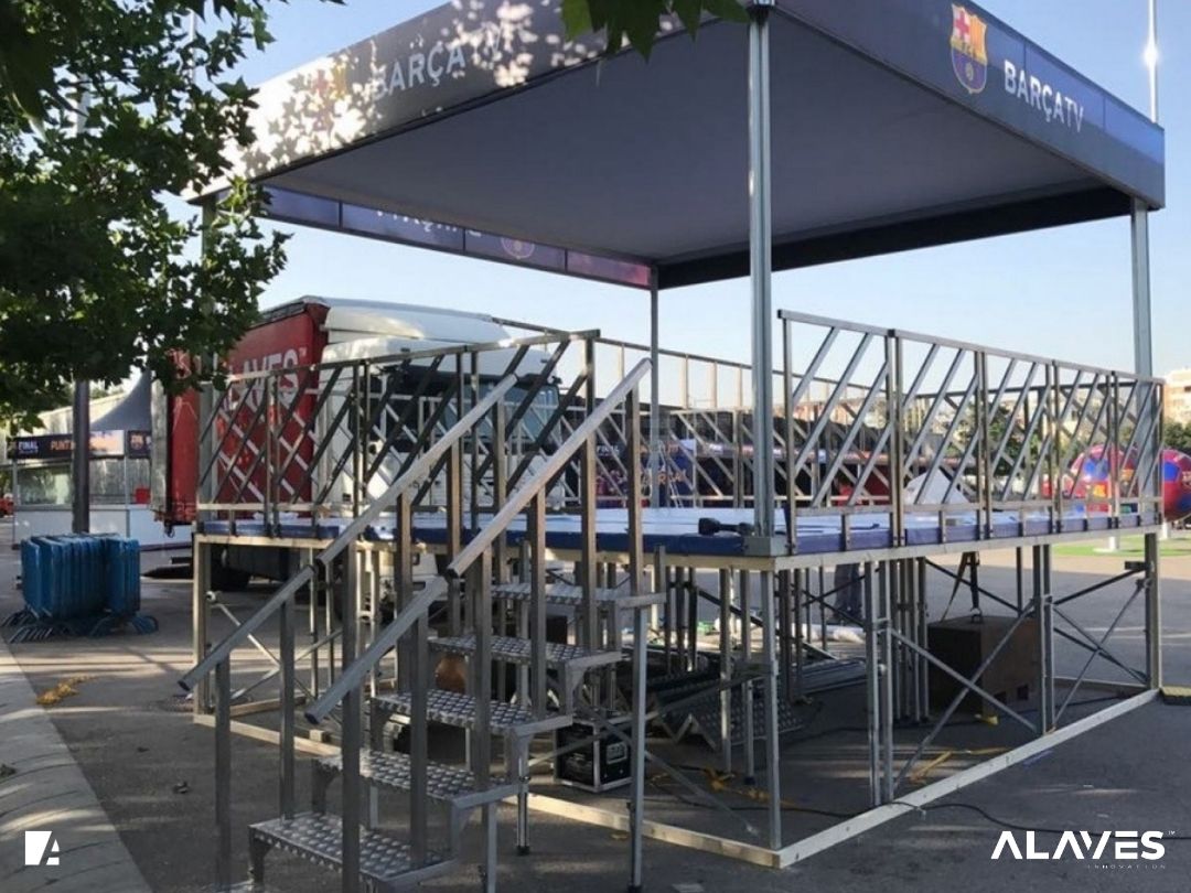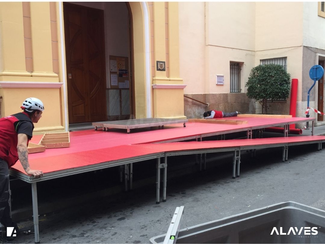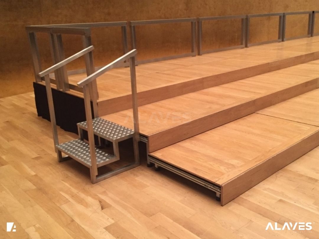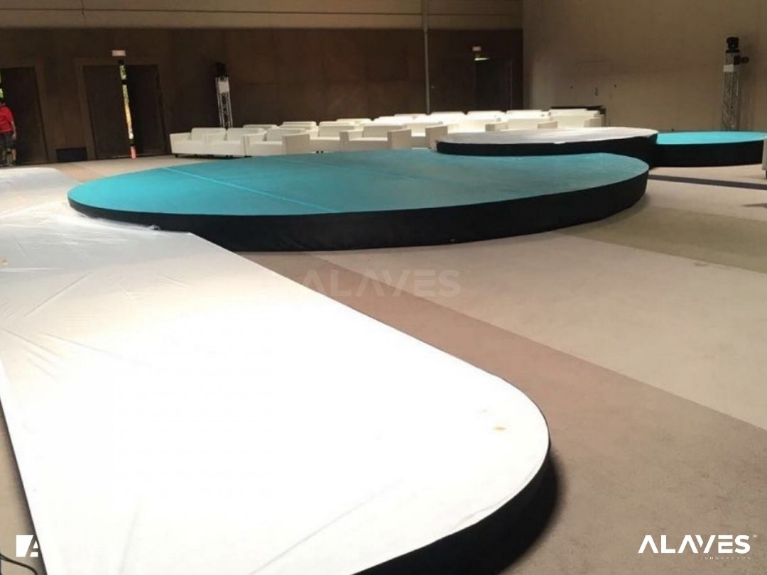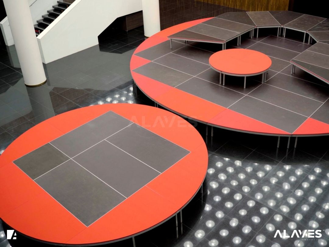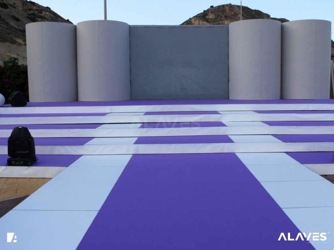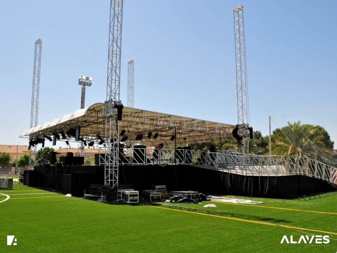 Nuestros escenarios con sistema PROKT™ destacan por su solidez, rapidez de montaje y adaptabilidad a cualquier superficie. Gracias a la combinación de tarimas modulares, patas telescópicas y accesorios patentados, ofrecemos soluciones seguras y versátiles que se ajustan a las necesidades de cada evento.