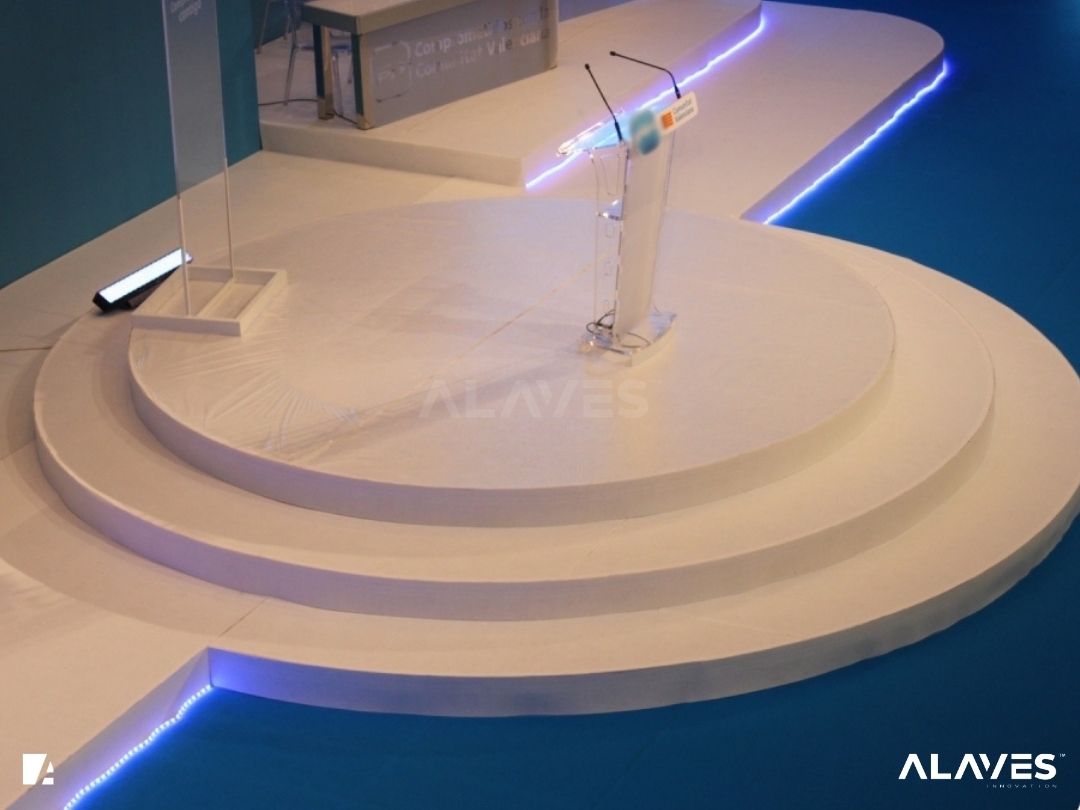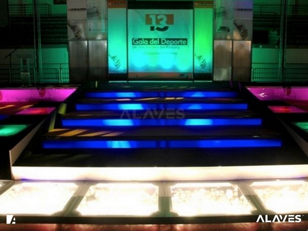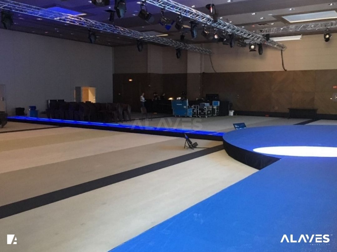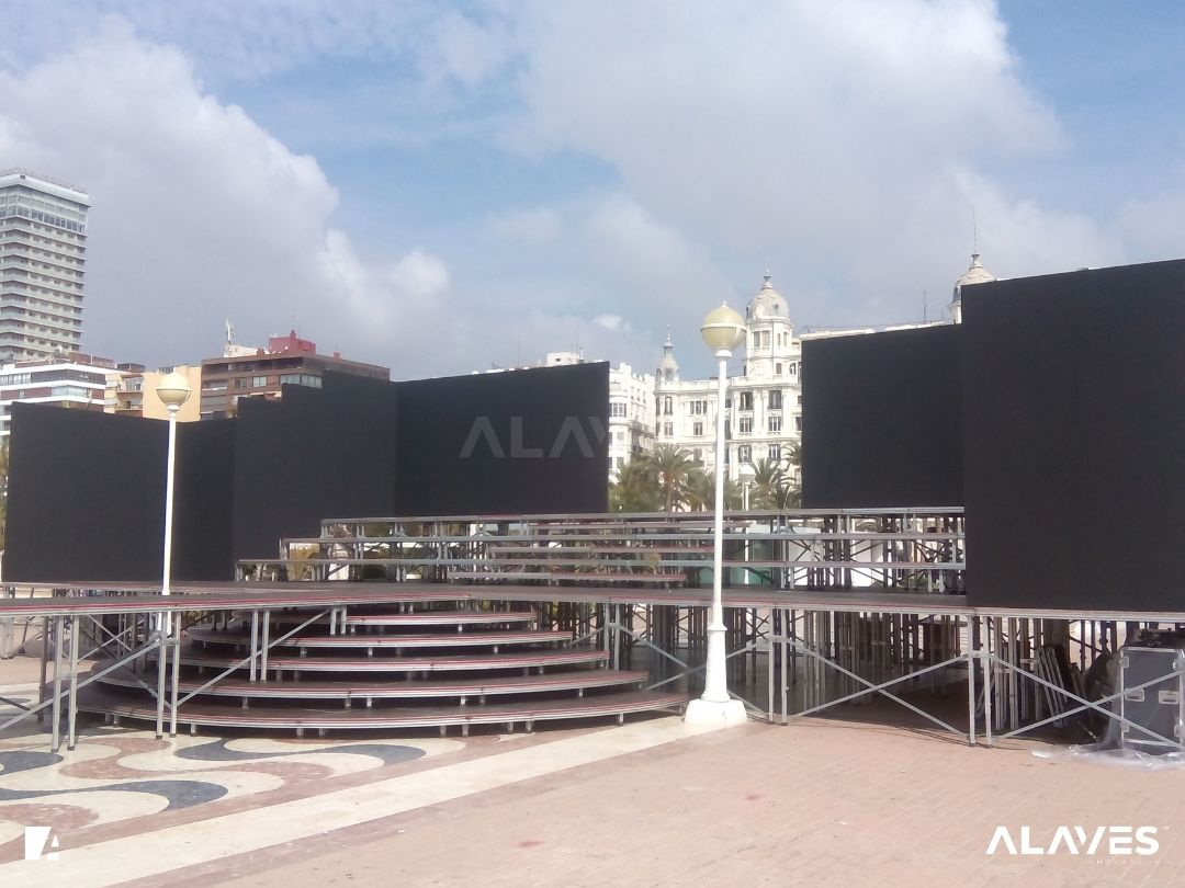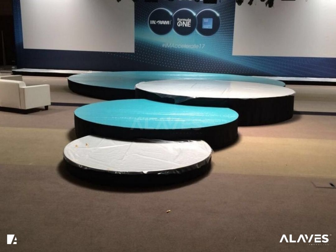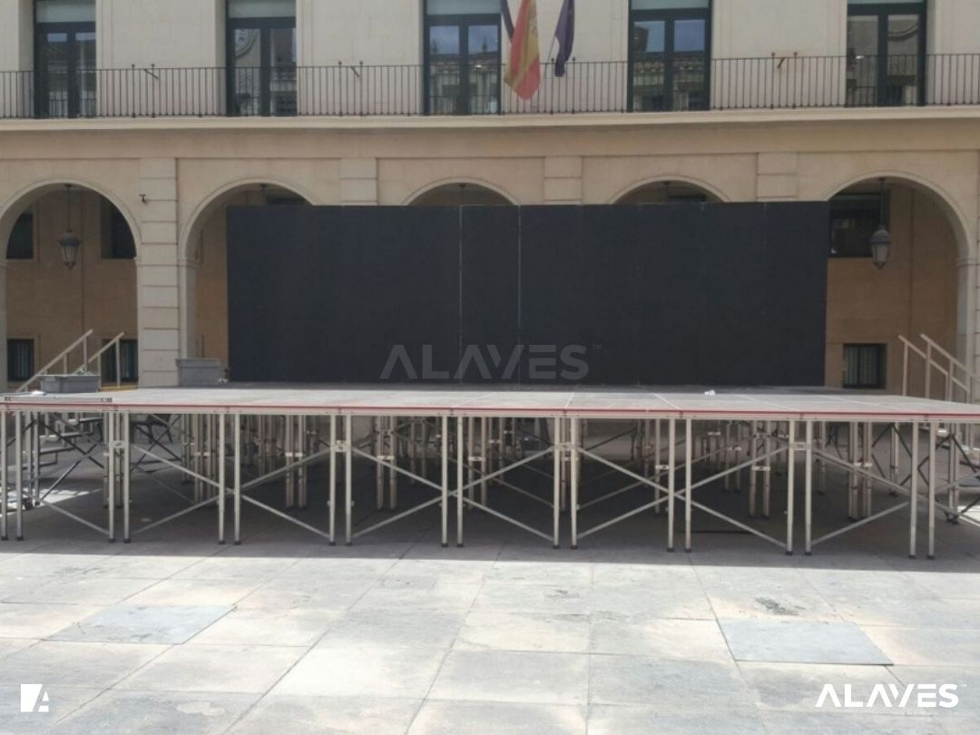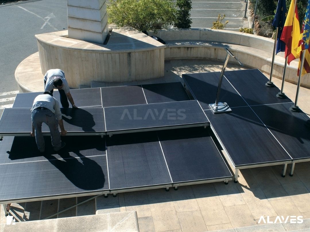 Nuestros escenarios con sistema PROKT™ destacan por su solidez, rapidez de montaje y adaptabilidad a cualquier superficie. Gracias a la combinación de tarimas modulares, patas telescópicas y accesorios patentados, ofrecemos soluciones seguras y versátiles que se ajustan a las necesidades de cada evento.