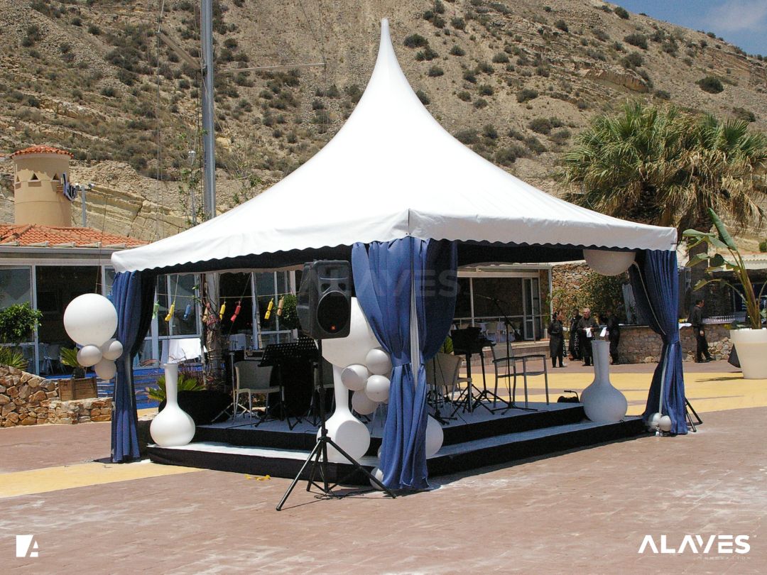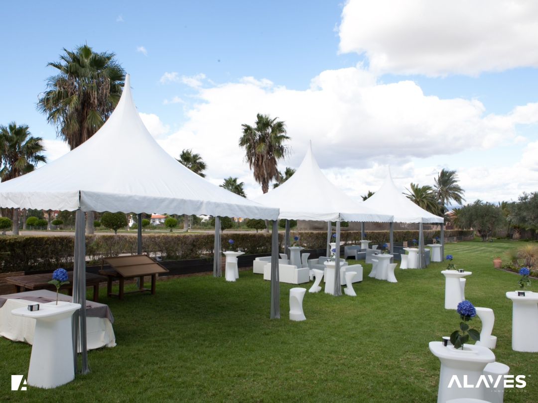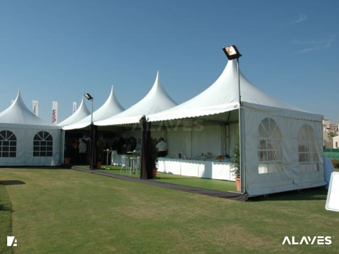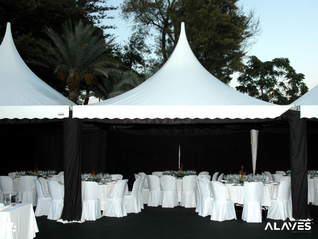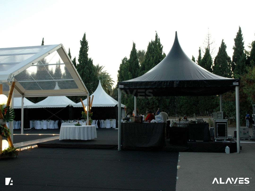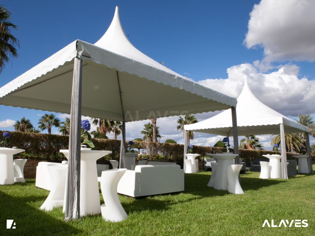 Las jaimas y pagodas son una solución práctica para eventos de menor escala que requieren cubrir espacios de forma sencilla y funcional. Su diseño con techo en forma piramidal facilita la evacuación de agua y aporta una estética básica y reconocible.