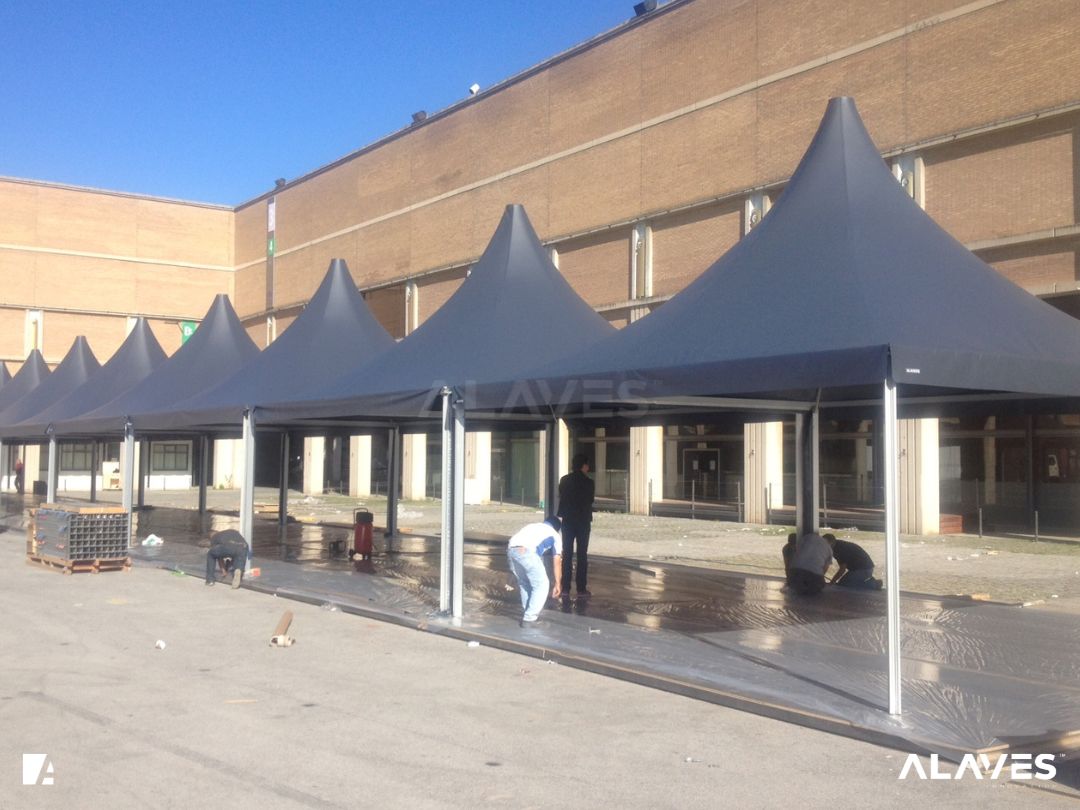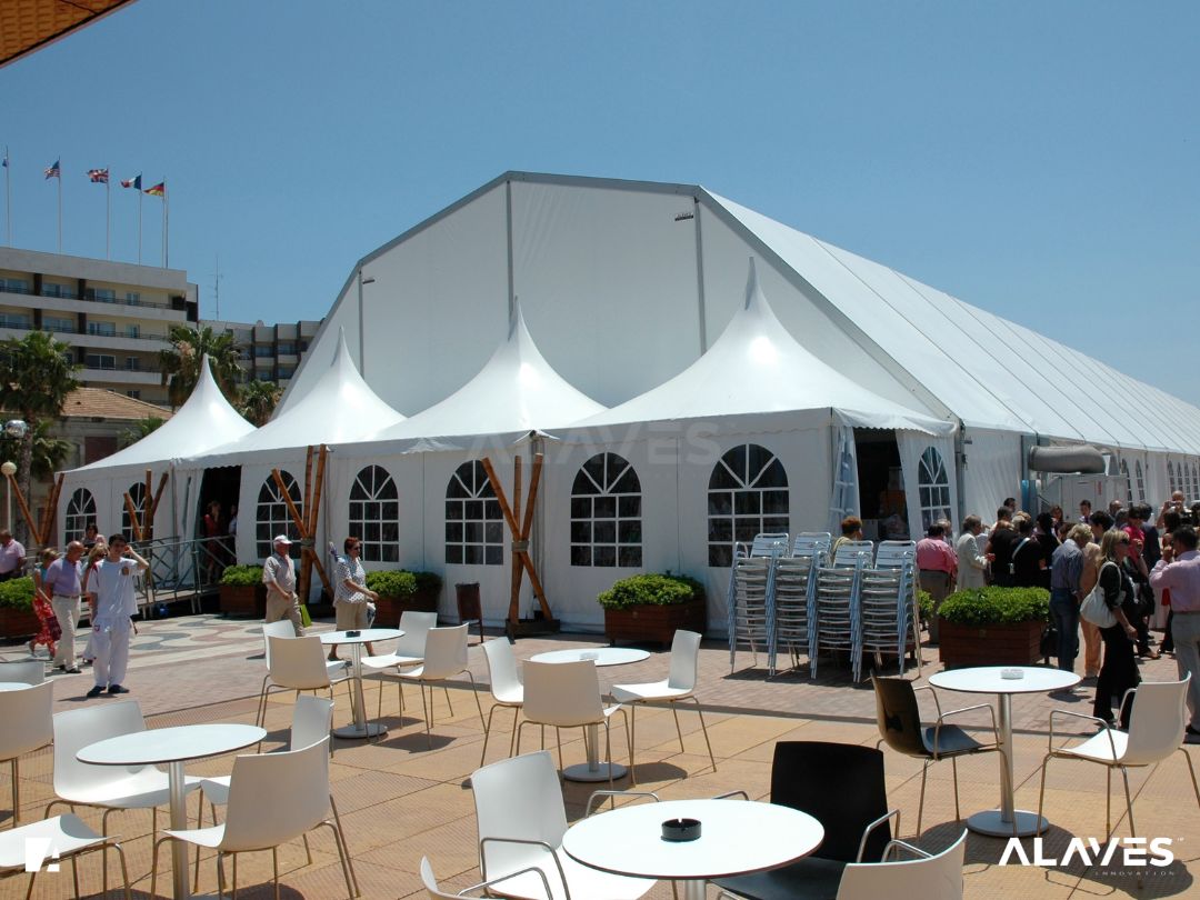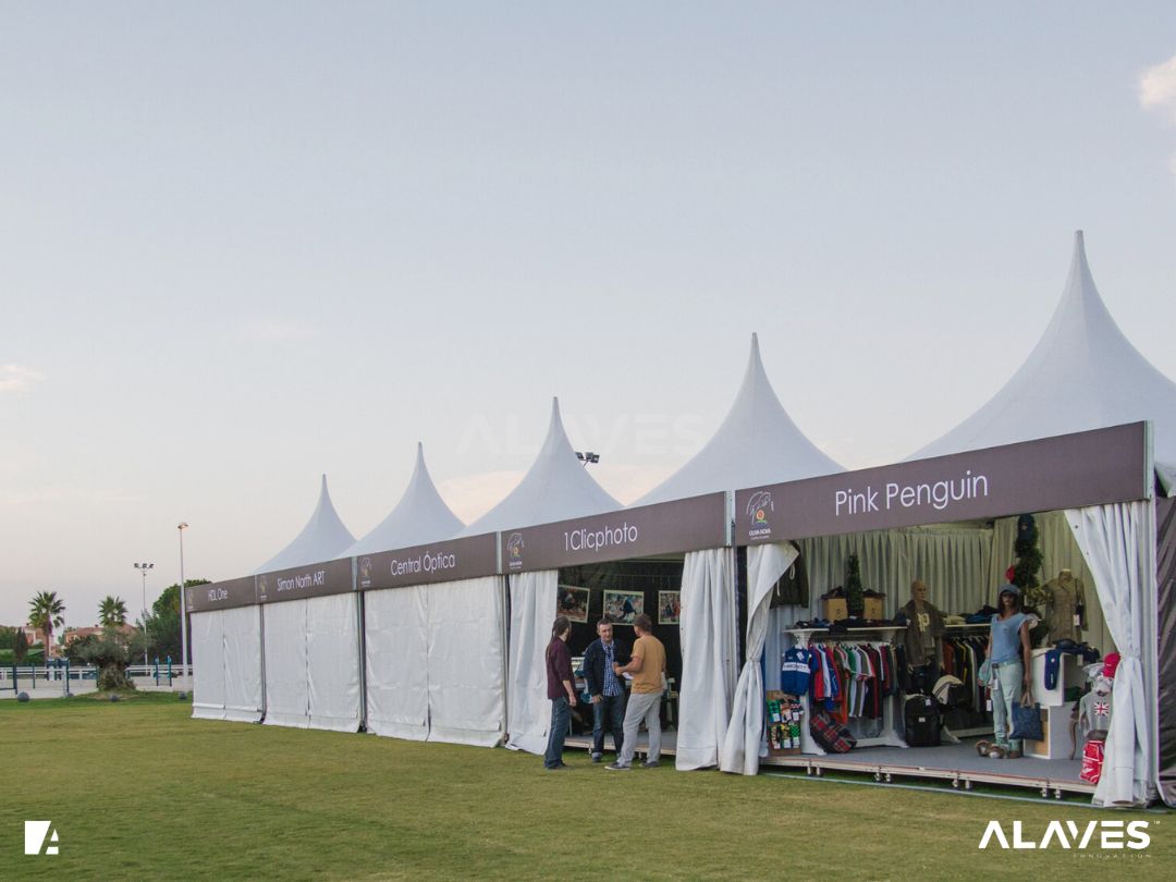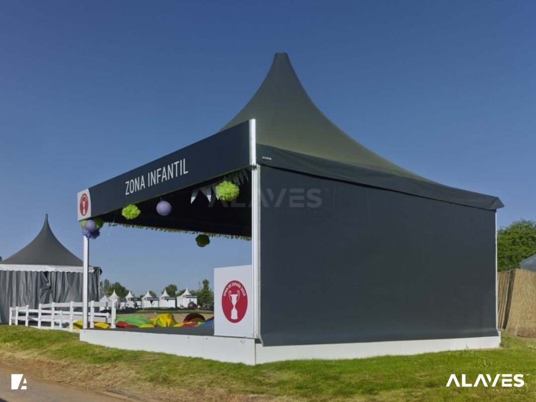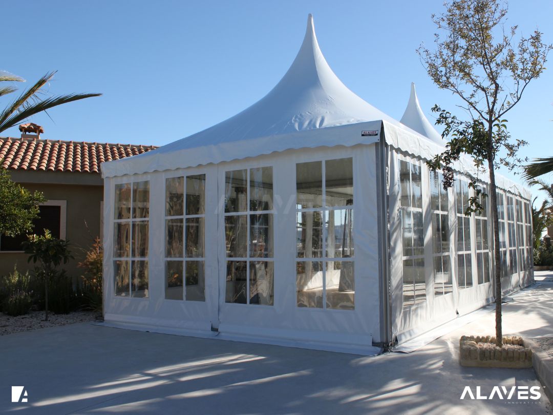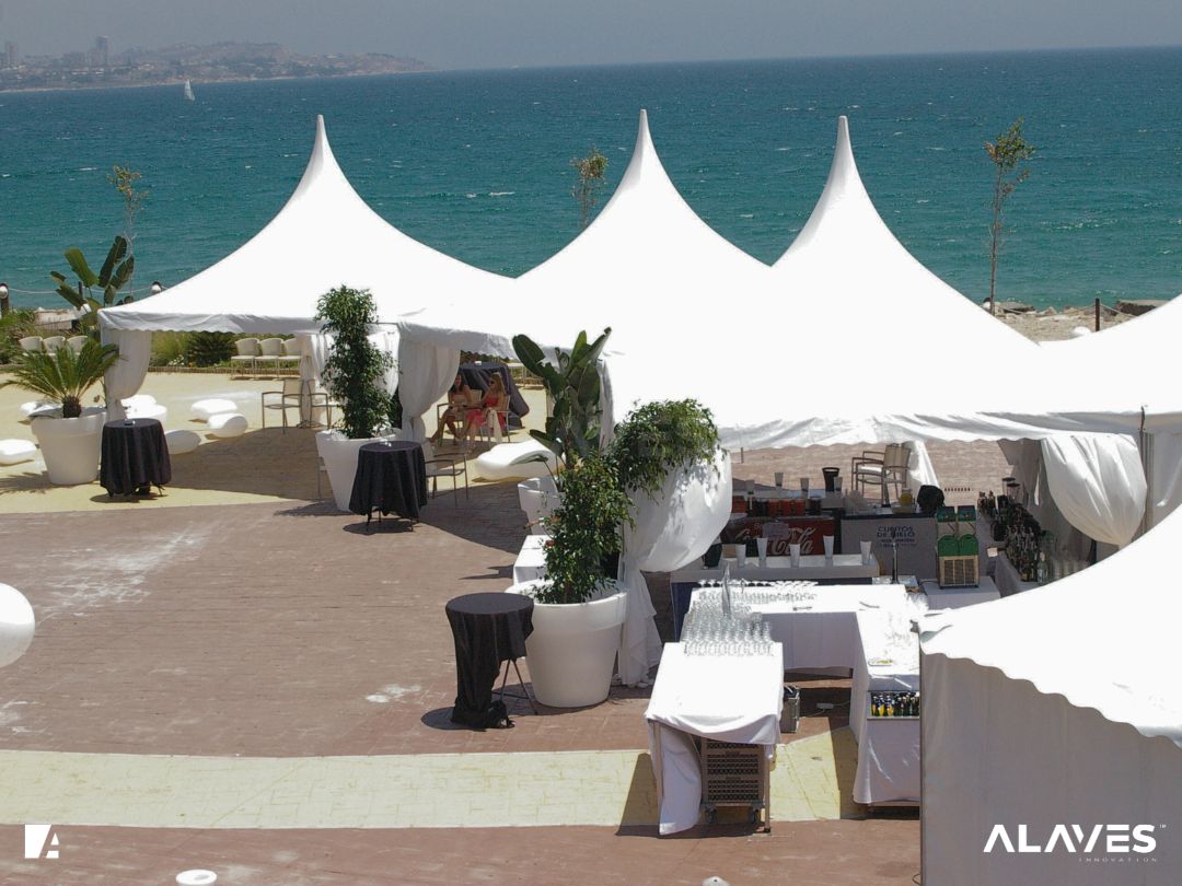 Las jaimas y pagodas son una solución práctica para eventos de menor escala que requieren cubrir espacios de forma sencilla y funcional. Su diseño con techo en forma piramidal facilita la evacuación de agua y aporta una estética básica y reconocible.