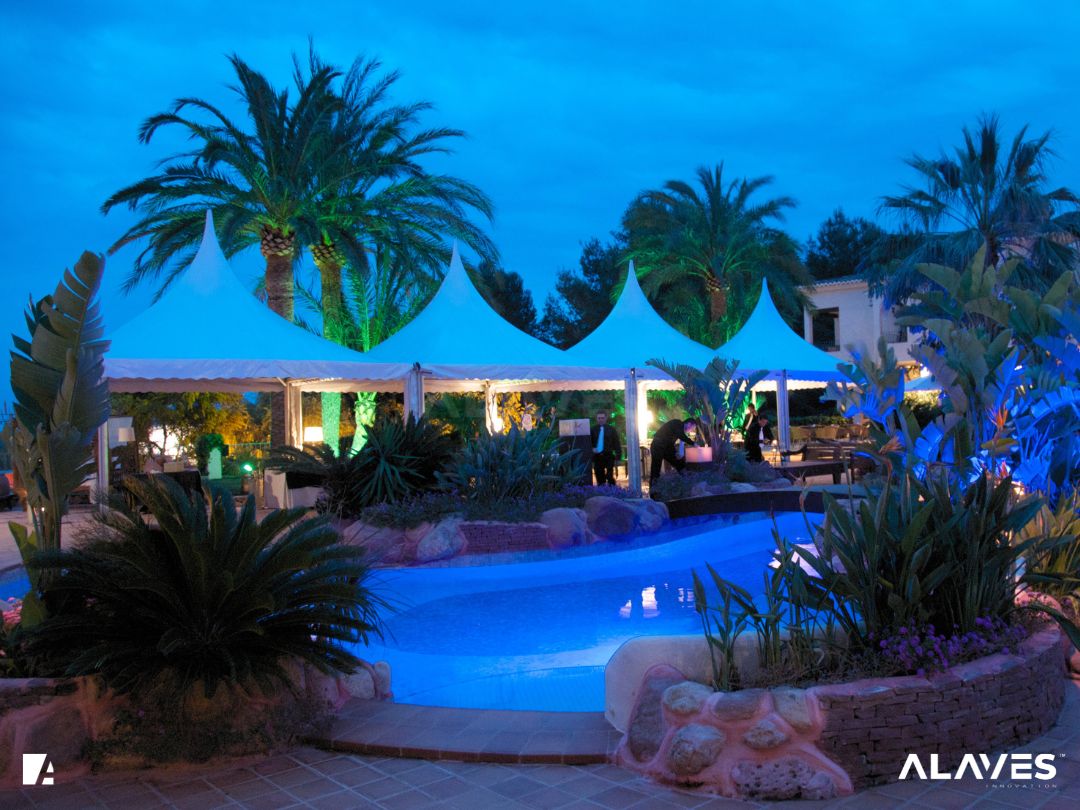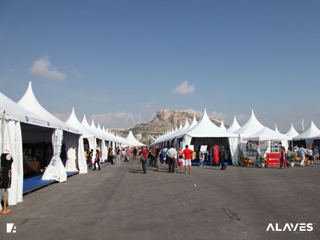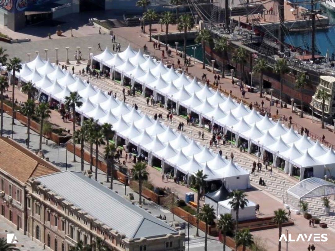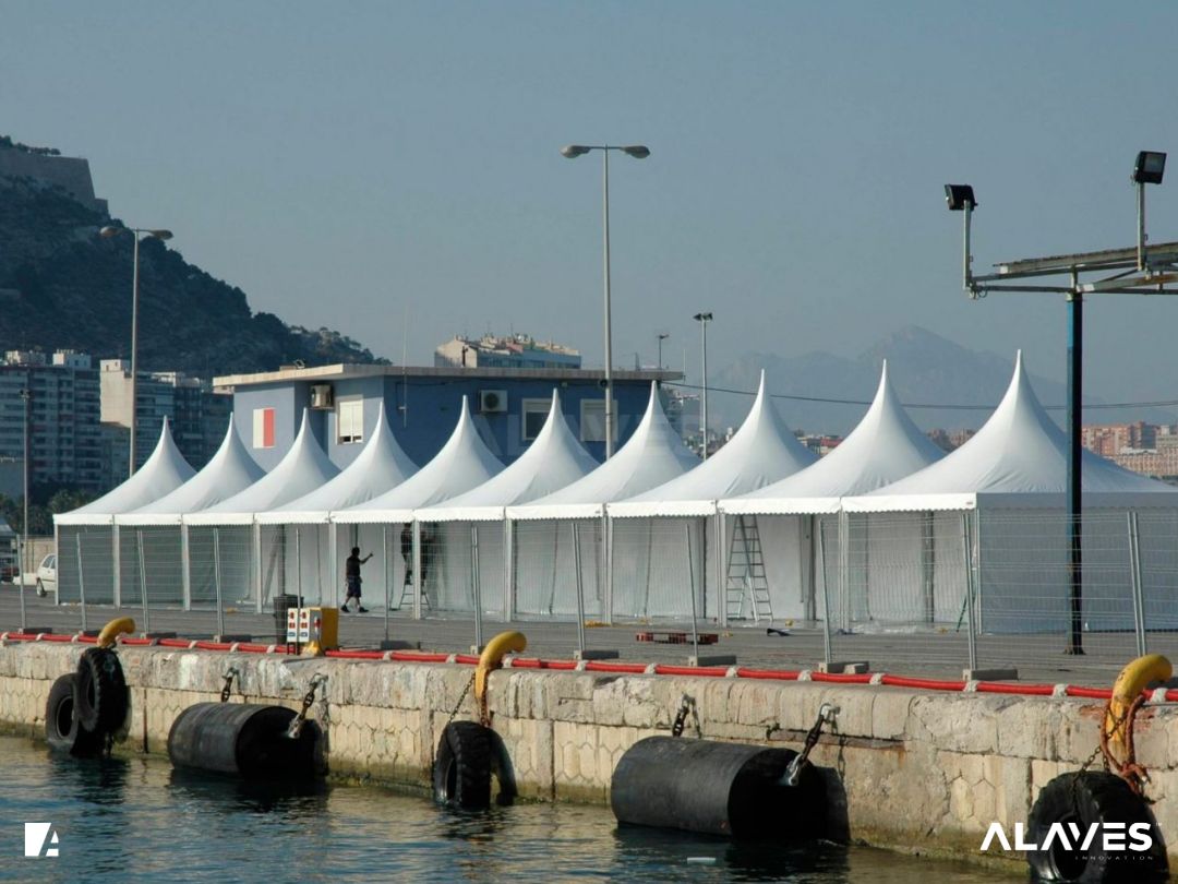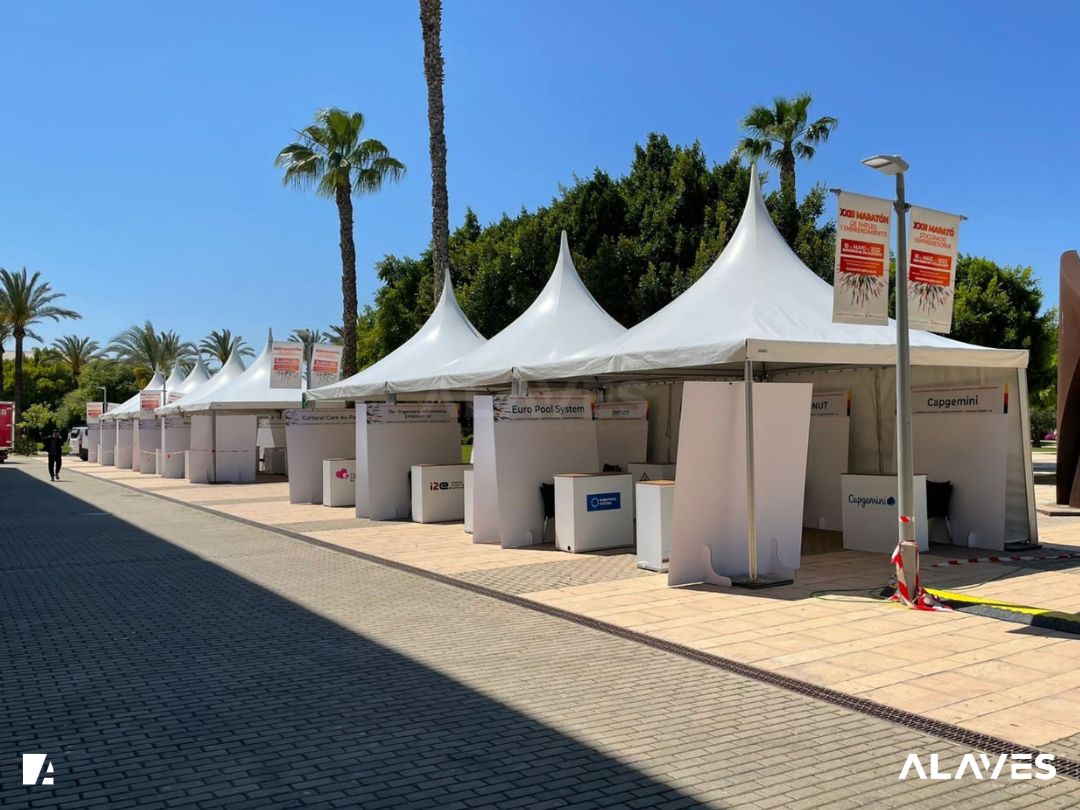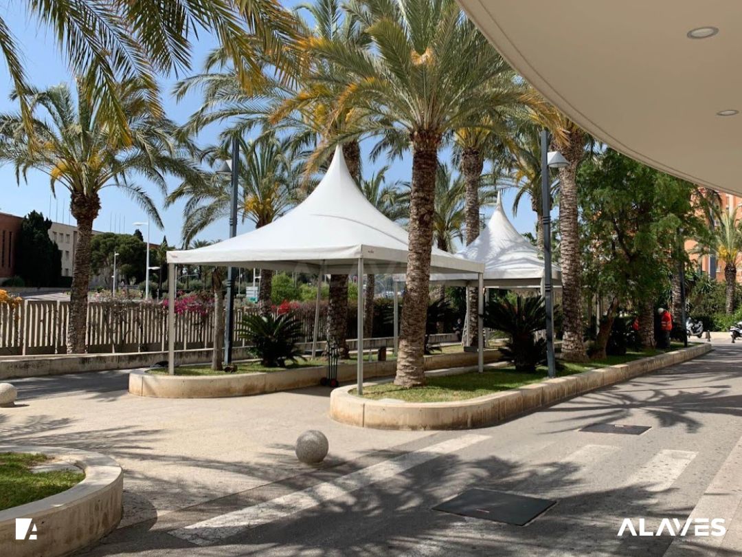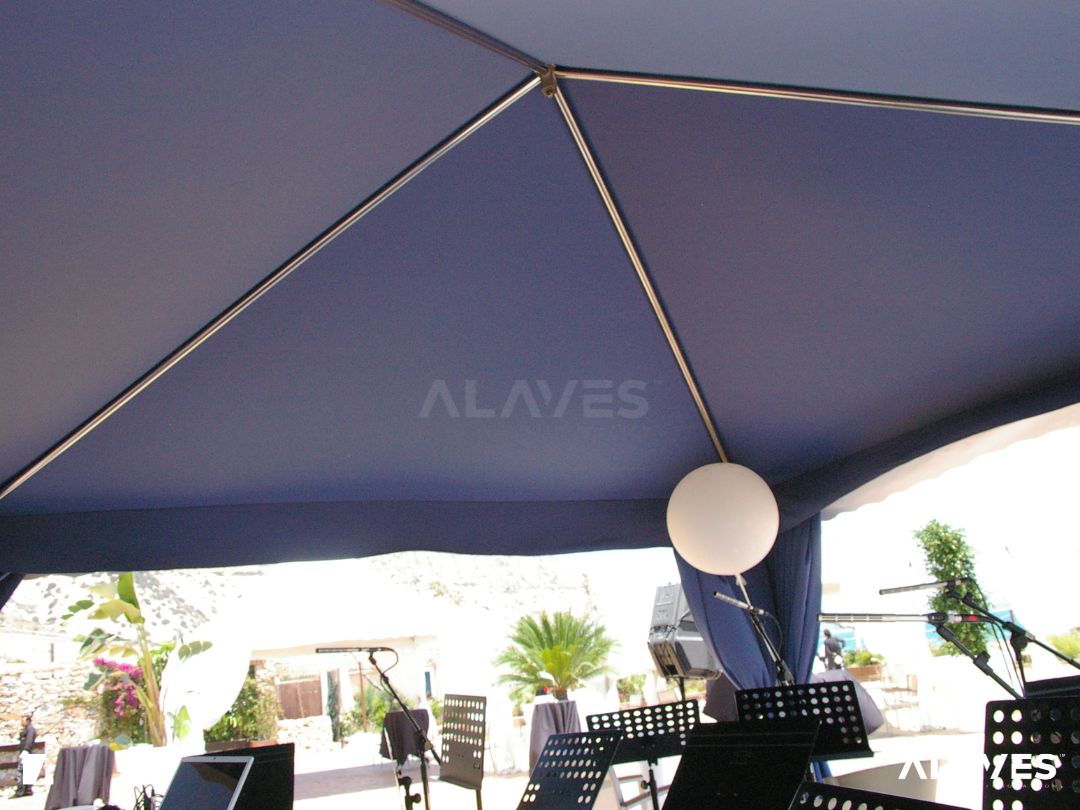 Las jaimas y pagodas son una solución práctica para eventos de menor escala que requieren cubrir espacios de forma sencilla y funcional. Su diseño con techo en forma piramidal facilita la evacuación de agua y aporta una estética básica y reconocible.
